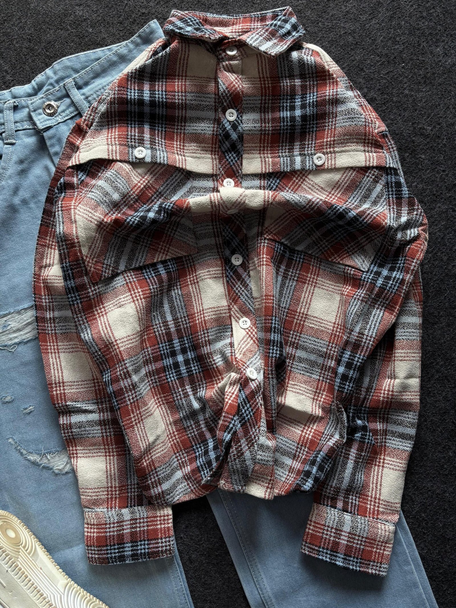 Our check shirt boasts a soft, breathable fabric and a timeless plaid design that adds character to your outfit. The baggy jeans complement it effortlessly, providing a relaxed fit that allows you to move freely while maintaining a stylish edge.